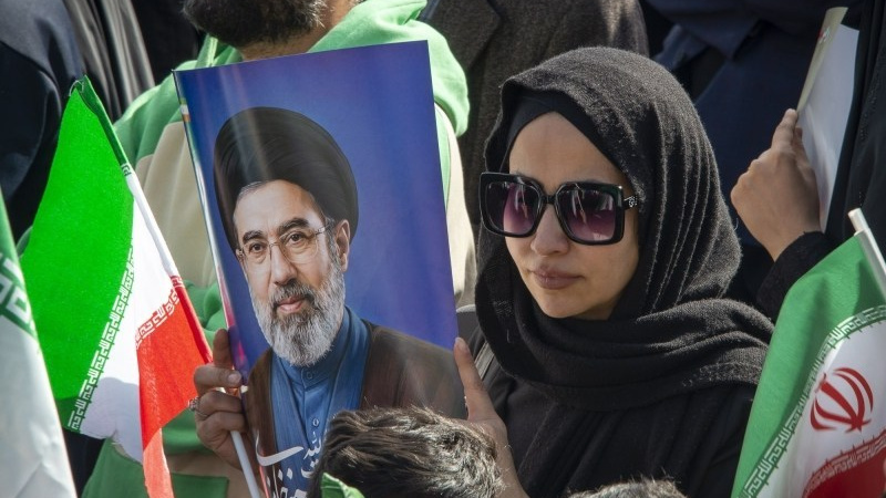 Poster Ayatullah Sayid Mojtaba Khamenei di tangan warga Iran