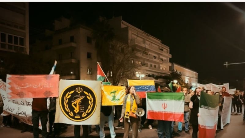Ribuan orang yang berkumpul di Lapangan Sindagma kemudian memulai aksi jalan‑jalan, membawa spanduk berisi slogan dan simbol anti‑imperialis serta bendera Palestina dan Iran, bergerak menuju Kedutaan Amerika Serikat di Athena, dan melantunkan slogan “Mampus Amerika”.(sl)