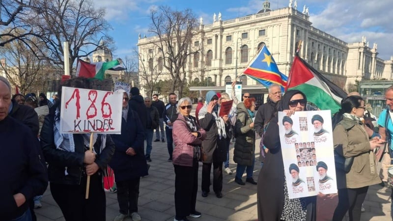 Di Wina, ibu kota Austria, para peserta mengutuk agresi ilegal rezim Zionis dan Amerika terhadap Iran serta menuntut penghentian kebijakan imperialistik. Mereka memperingati syuhada dengan menata meja dan bangku sekolah serta memajang foto‑foto siswa yang gugur di sekolah Minab, Iran.