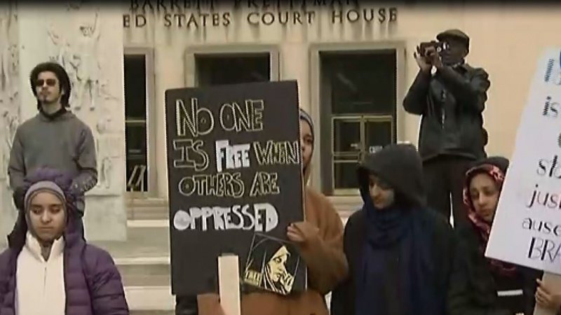 Puluhan aktivis menggelar unjuk rasa di depan pengadilan federal di Washington pada hari Rabu, 23 Januari 2019 untuk menyatakan dukungan mereka kepada Presenter Press TV Marzieh Hashemi yang ditangkap oleh FBI, Amerika Serikat.