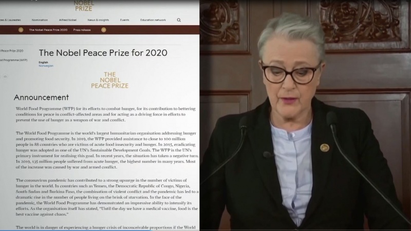 Badan Pangan Perserikatan Bangsa-Bangsa, Program Pangan Dunia atau WFP, memenangkan Hadiah Nobel Perdamaian 2020 atas upayanya memerangi kelaparan dan meningkatkan kondisi perdamaian di daerah-daerah yang terkena dampak konflik.