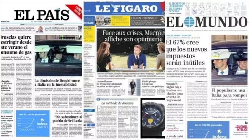 Ecco per citare i primi titoli e sommari di alcuni media europei, cominciamo lo spagnolo El Pais: "L'Italia si avvicina alle elezioni anticipate dopo che Draghi non riceve la fiducia del Parlamento. I partiti di destra e il Movimento 5 Stelle decidono di non votare la mozione di fiducia. Il primo ministro si incontra con il capo dello Stato per presentare le sue dimissioni".