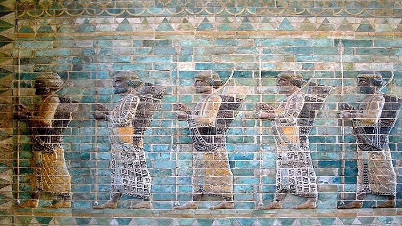 Le pareti interne erano rivestite di mattone smaltato e ritraevano immagini degli Immortali (unità d’élite della guardia imperiale del Grande Re persiano), di un leone alato e del fiore della campanella azzurro.