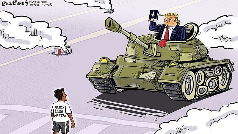 - Trump a bordo di un carro armato con la Bibbia in mano, pronto a reprimere I manifestanti contro razzismo begli USA, in stile Tienanmen ...