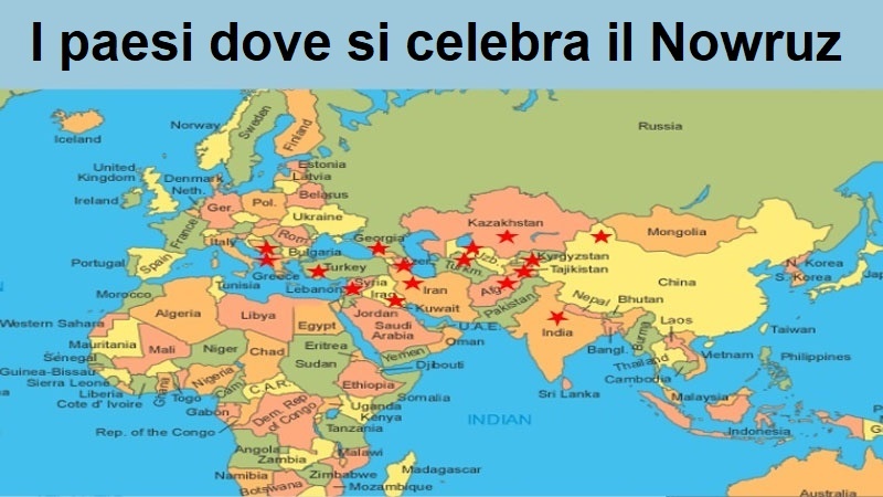 - Oggi il Nowruz viene festeggiato nei territori in cui arrivò l'impero persiano: Iran, Azerbaigian, Afghanistan, Albania, Bosnia, Georgia, Turkmenistan, Tagikistan, ...