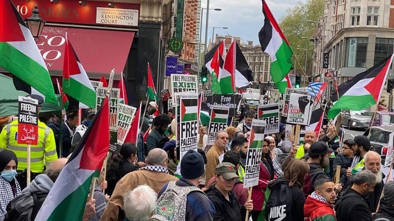 - Un gruppo di attivisti pro Palestina si sono riuniti lunedì sera davanti all'ambasciata sionista a Londra lanciando slogan a sostegno del popolo palestinese e dell'operazione militare della resistenza Hamas, Tempesta di Al-Aqsa.