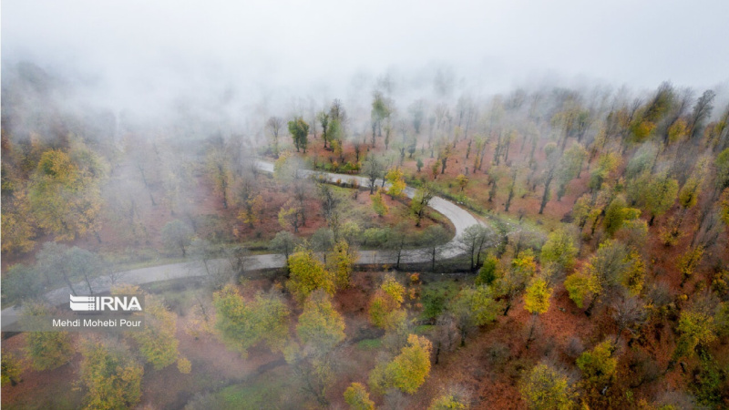 - L'Iran del nord, gli alberi d'autunno fotografati dall'alto in nebbia.