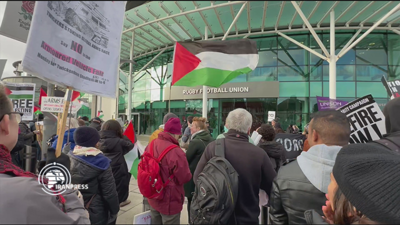 - Gli attivisti davanti allo stadio di Twickenham, ovest della capitale inglese di Londra, per condannare la fornitura di armi e munizioni al regime sionista.