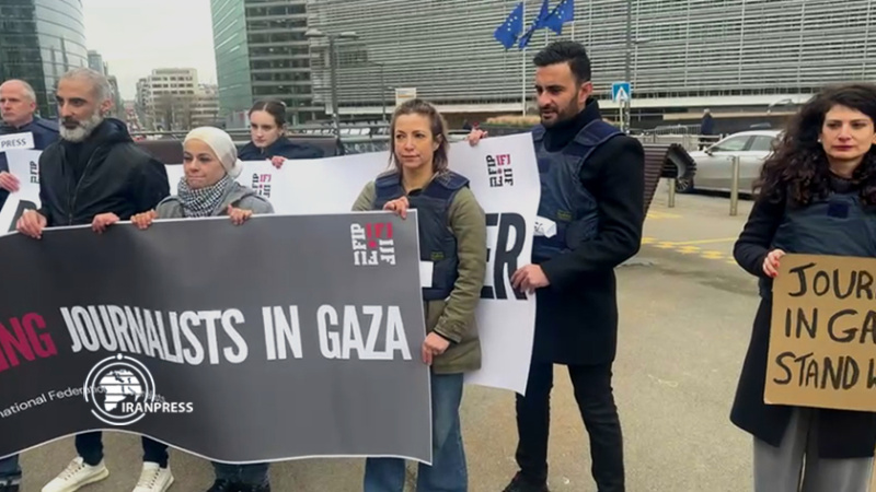 - Un gruppo di giornalisti indipendenti davanti alla sede della Federazione internazionale dei giornalisti a Bruxelles per condannare l'uccisione dei reporter palestinesi nella Striscia di Gaza.