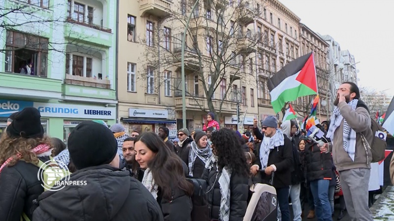 la guerra genocida del regime sionista nella Striscia martoriata.I dimostranti sono scesi in piazza a Berlino per la 15esima settimana consecutiva per chiedre al loro governo di non sostenere i crimini di Israele nell'enclave palestinese. La scorsa settimana la Germania ha annunciato di sontinuare a schierarsi senza se e senza ma con Israele. Il governo Scholz ha fatto sapere che Berlino interverrà davanti al tribunale dell’Aia a difesa dei sionisti, ovvero contro l’accusa di genocidio presentata dal Sudafrica.