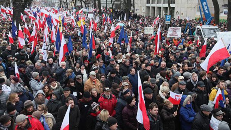 da misure del governo ritenute antidemocratiche mentre la crisi politica nel Paese si fa sempre più acuta. Una folla di duemila persone protesta al grido di "libertà, uguaglianza e democrazia", svengolando le bandiere polacca ed europea.