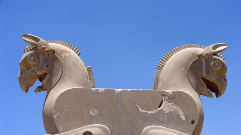 Quello che abbiamo sommariamente detto di Pasargade è ben lontano dal coprire tutto quello che c’era un tempo. Ciro il grande aveva scelto questo luogo come residenza, eleggendolo a capitale eterna. E fu ancora lui a far costruire la grande piattaforma di pietra di Persepoli, che sorge sulla montagna di Rahmat. Per ragioni che André Godard ha spiegato, non è possibile che sia stato Dario, con tutti gli impegni politici e militari che ebbe, a costruire in pochi decenni questa grande piattaforma, insieme al suo palazzo personale a Pasargade. Per questo, la base di Persepoli deve essere stata eretta nell’epoca di Ciro, per essere completata sotto Dario. La piattaforma ha i lati occidentale, orientale e meridionale rispettivamente di 455, 300 e 290 metri, mentre l’altezza del lato meridionale è di 18 metri. L’archeologo Ernst Herzfeld ha scoperto, in una torre nella parte nord di Persepoli, 30.000 tavolette con incisioni in lingua elamitica e documenti ufficiali del regno di Dario, le quali purtroppo non si sa che fine abbiano fatto. Persepoli è un esempio molto ricco e interessante dello splendore dell’architettura achemenide, ed è il prodotto dell’esperienza accumulata dagli abili architetti iraniani nella costruzione dei palazzi di Pasargade e di Susa. Per accedere alla grande piattaforma c’è solo una scalinata a due direzioni, posta a nord sul lato occidentale, che conduce il visitatore ad ammirare un maestoso portale di pietra, la “Porta delle Nazioni”. Tale portale fu iniziato da Dario e portato a termine da Serse. L’edificio ha tre porte: la porta occidentale, aperta sulla scalinata, la porta orientale, che dà accesso ad lungo un viale che prosegue verso est, e la porta meridionale, che si affaccia sul cortile dell’Apadana. L’architrave del portale era retto da quattro colonne, alte oggi più di 14 metri e che dovevano essere alte in origine almeno 16. Il passaggio orientale e quello occidentale del portale era “sorvegliato” da statue di tori alati antropomorfi. I tori, ispirati all’arte assira, differiscono dai tori assiri nel fatto che hanno una zampa in meno, quattro invece di cinque.
