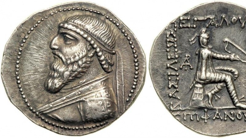 La più antica moneta arsacide è attribuita a Mitridate I, e vi è impressa l’immagine di una testa senza barba, altèra e coraggiosa, naso aquilino, sopracciglia sporgenti e occhi più grandi del normale, labbra curve e mento volitivo. Sulla testa si vede un copricapo morbido in feltro o pelle, con la punta piegata in avanti e due strascichi lasciati cadere sulle spalle, uno avanti e uno indietro. Il copricapo è simile a quello dei Saka, raffigurato nelle immagini achemenidi, e presenta anche alcune similitudini con quello dei Medi. Sull’altra faccia della moneta è raffigurato, in modo molto più stilizzato, un uomo seduto, vestito alla maniera meda e dotato di arco; da ambo i lati dell’uomo vi sono scritte in caratteri greci. Probabilmente si tratta dell’immagine di Arsace I, fondatore della dinastia, e figura simbolica per gli Arsacidi.