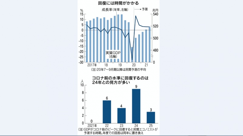 日本政府が、GDP・国内総生産が新型コロナウイルス感染拡大前の水準に回復するのは2022年度中との見通しを示しています。