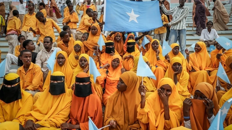 イスラエルによるソマリランド国家承認の決定に抗議し国旗を振る市民ら、ソマリア首都モガディシュで(AFP通信)