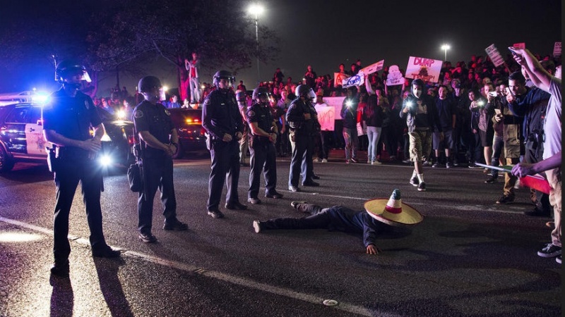 アメリカ大統領選挙の共和党有力候補のトランプ氏に反対するデモの中で、抗議者が警察と衝突しました。