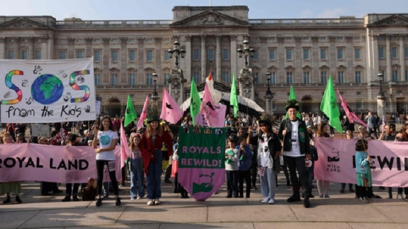 英ロンドンで9日土曜、王室が所有する土地の自然回復や同国全土での生物多様性の保全を求め、子どもたちがバッキンガム宮殿に向けてデモ行進しました。