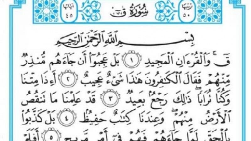 「ガーフ。聖典コーランに誓って。彼らの間から警告する者が現れたことに、彼らは驚き、不信心者たちは言う。『これは不思議なことだ。私たちは死んで土になったとき[、再び蘇らされるのか]。そのような復活などありえない』」
