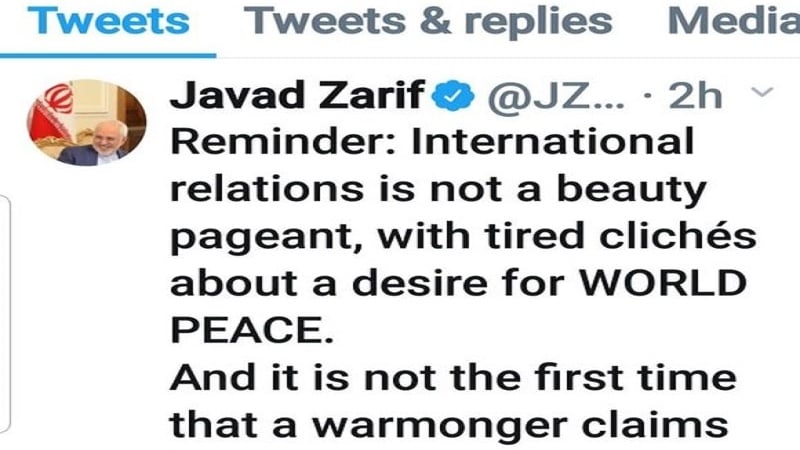 Fars ақпарат агенттігінің хабарлауынша, Зариф: "АҚШ-тың саудасын тоқтатып, АҚШ-тағы 100 000 жұмыс орнын жою біз үшін мәселе емес. Бірақ әлем асығыс жазылған твиттерлік нұсқауларға құлақ аспайды. Мұны Еуропа Одағы, Ресей, Қытай мен Иранның ондаған серіктестерінен сұраңыздар. Халықаралық қатынастар бір сөзді қайталай беретін келбеттілерді таңдайтын жарыс емес. Соғысқұмар бір адамның "әлемдік бейбітшілік" үшін деп соғыс бастауы да алғашқы рет емес",- деді.