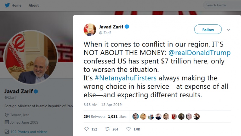 Мұхаммад Джавад Зариф сенбі күні Twitter-дегі жеке парақшасында: "АҚШ Президенті Дональд Трамп өз елінің Батыс Азия аймағындағы жағдайды одан ары ушықтыру үшін 7 трлн доллар жұмсағанын мойындады. Ал сионистік режимнің Премьер-министрі Беньямин Нетаньяху әрдайым ең нашар таңдау жасап, оның нәтижесінің басқа болуын қалайды",-деді.