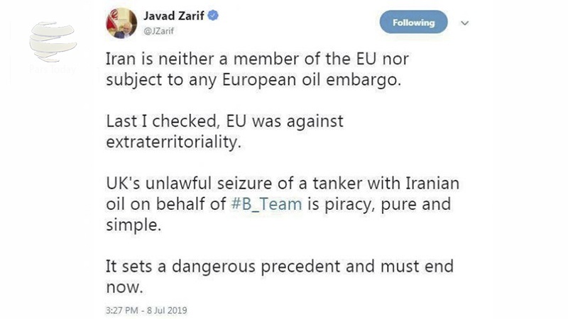 Иран Сыртқы істер министрі Гибралтар жағалауындағы Британия теңіз күштерімен ирандық танкердің тұтқындалуын «Б тобының» қатысуымен жасалған қатерлі сынақтама деп тапты.