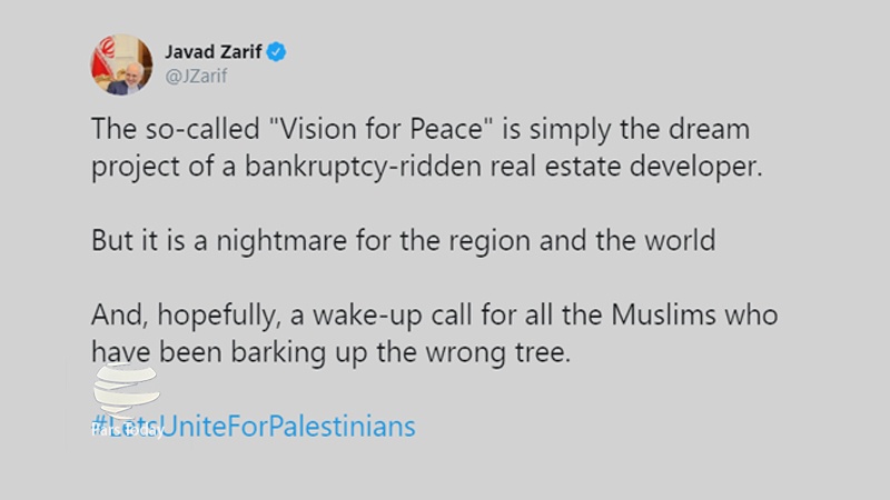 Iran Press ақпарат агенттігінің хабарлауынша, Мұхаммад Джавад Зариф сейсенбі күні кешке Twitter-де "Бейбітшілік перспективасы" жобасын банкрот болған қияли алып-сату жобасы деп атап: "Ғасыр мәмілесі" – қате жолға түскен барлық мұсылмандар үшін қатер дабылы",-деді.
