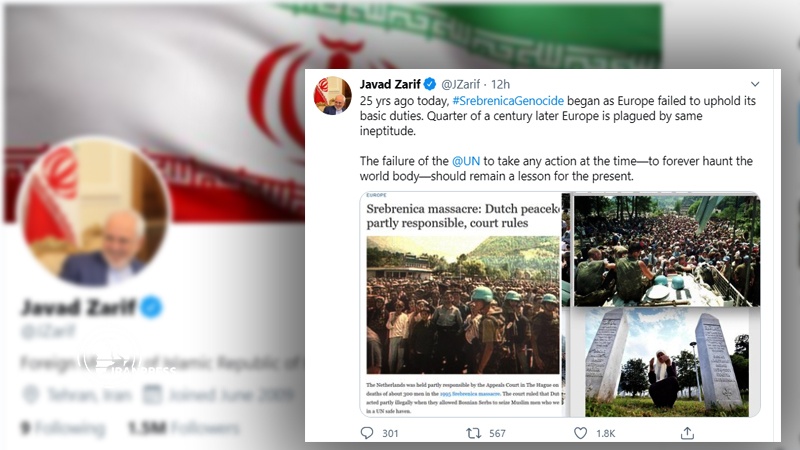 Мұхаммад Джавад Зариф сенбі күні Twitter-дегі парақшасында осыдан 25 жыл бұрын орын алған Сребреница геноцидіне тоқталып: «Еуропа ширек ғасыр өткенімен ұқсас дәрменсіздікке шалдығуда. БҰҰ-ның сол кездегі шара қолданбауы бүгінгі күн үшін сабақ болуы керек»,- деп жазды.