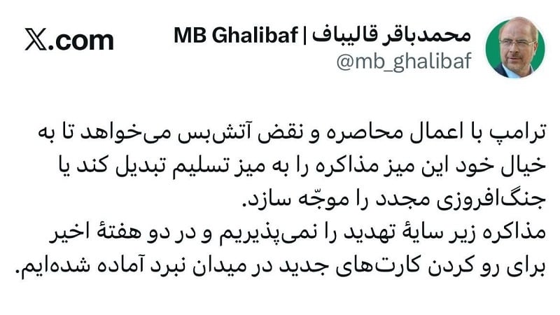 ParsToday хабарлауынша, Парламент спикері Мұхаммад Бақер Қалибафтың X-тегі мәтіні келесідей:Блокаданы енгізу және атысты тоқтатуды бұзу арқылы Трамп келіссөз үстелін бағыну үстеліне айналдырғысы немесе соғысты қайта тұтандырғысы келеді.