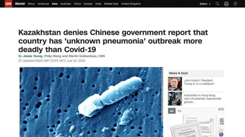Қытайдың кейбір ақпарат құралдарында Қазақстанда коронавирусқа қарағанда өлімге көптеп әкелетін белгісіз пневмония жағдайлары белгілі болғандығы туралы айтылған.