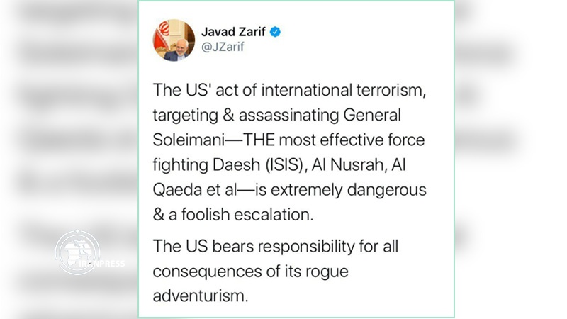 Иран Сыртқы істер министрі Мұхаммад Джавад Зариф жұма күні АҚШ‑тың генерал‑майор Қасым Солейманиді шәһид еткенін айыптап: «Америкалық лаңкестік күштердің терроризм және экстремизммен күрес қаһарманы сардар Солейманиге террор жасаудағы ақымақтығы аймақ пен әлемдегі қарсыласу ағашын мықтыландыра түсетіні анық.