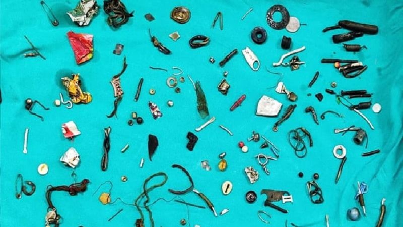 د هندوستان د دغه مریض د خیټې د درد د نه کمیدا په وجه ډاکټرانو هغه ته د ایکسرې کولو مشوره ورکړه چې د درد دلیل معلوم شي او له ایکسرې وروسته د ناروغه کس په خیټه کښې ګڼ شمیر شیان ولیدل شول.