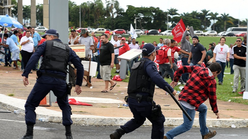 A esplanada dos ministérios foi palco de um intenso confronto entre os manifestantes e a polícia. O térreo do Ministério da Agricultura ficou em chamas e uma enorme nuvem de fumaça negra encobriu os edifícios da esplanada.