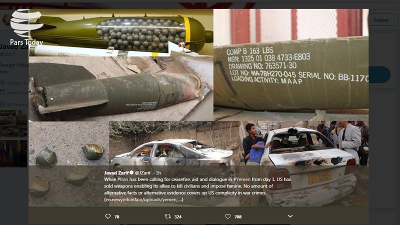 O ministro das Relações Exteriores, Mohammad Javad Zarif, criticou os EUA por fornecer seus aliados com armas para matar civis, dizendo que o Irã defendeu a paz e o diálogo no Iêmen.