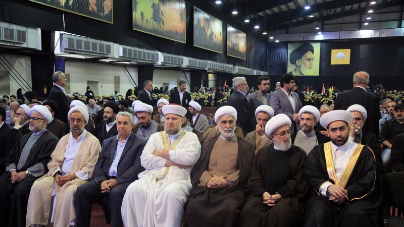 Milhares de pessoas de diferentes formas de vida e muitas figuras religiosas e políticas libanesas e palestinas que participam do Dia Internacional Quds se reúniram no sul de Beirute em 23 de junho de 2017.