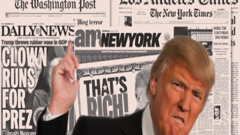 O ataque de Trump contra a mídia começou a partir do primeiro dia de sua campanha para a presidência. Em uma ocasião ele disse que não era o momento de competir com Hillary Clinton, mas viu a batalha contra a mídia. Trump  repetidamente tem atacado a mídia americanas famosas, inclusive o New York Times. Uma vez ele disse que poderia dizer a um jornal que está fracassado e em breve estará fora de circulação e durante a sua campanha eleitoral também colocado sob questão dos inquéritos deste jornal. Ele até questionou as fontes deste  jornal que não existia. Ele disse uma vez: "Dentro de alguns dias, uma pessoa talentosa vai comprar o pobre impostor New York Times se você não operar corretamente é melhor  que educadamente feche ".