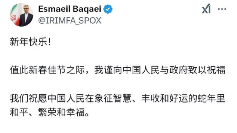 Согласно сообщению сети Sahab со ссылкой на информационное агентство Mehr, в сети «X» было опубликовано: Эсмаил Бекаи пожелал мира, процветания и счастья народу Китая одновременно поздравив их с китайским Новым годом (с 21 января по 20 февраля).
