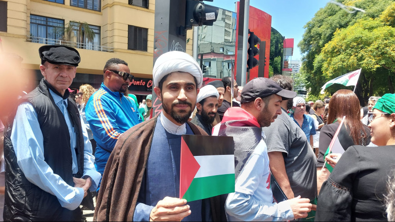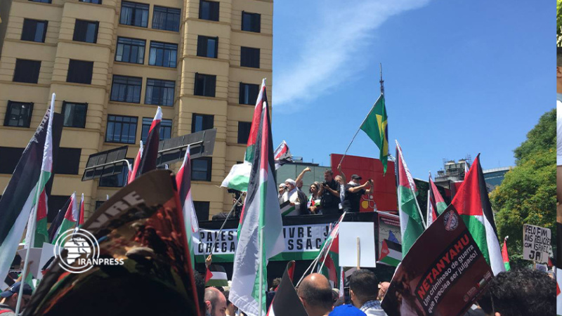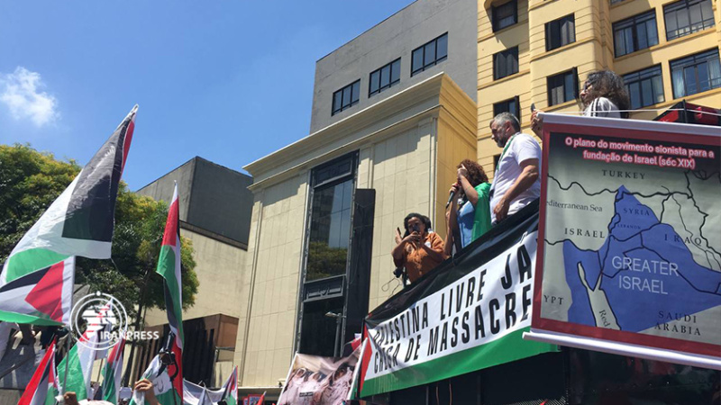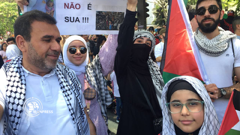 Иранцы, живущие в Бразилии, приняли массовое участие в этом антисионистском митинге. Они держали в руках флаги Палестины и фотографии ужасных преступлений сионистского режима в секторе Газа, демонстрируя их миру, особенно правозащитным организациям.