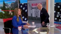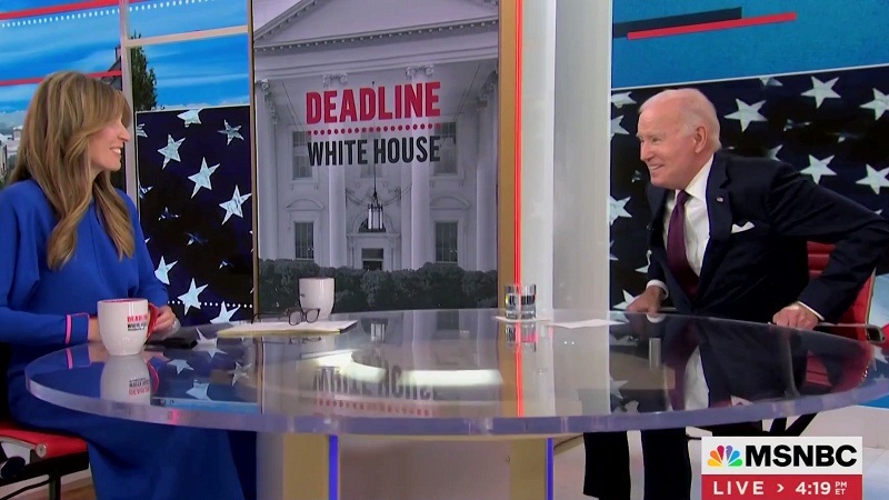 Президент США Джо Байден в четверг выделился очередной странностью и во время прямого интервью телеканалу MSNBC, когда ведущая начала благодарить его за визит, резко встал с кресла, хотя прямой эфир еще не закончился, пожал ей руку и поспешил выйти за кулисы.