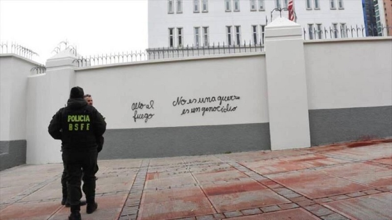 Десятки боливийских женщин также собрались перед американским посольством в Ла-Пасе, столице Боливии, в знак протеста против преступлений и нападений сионистского режима на сектор Газа. Они написали лозунги «Это не война, это геноцид». и надпись «Прекращение огня» на стене американского посольства в Боливии.