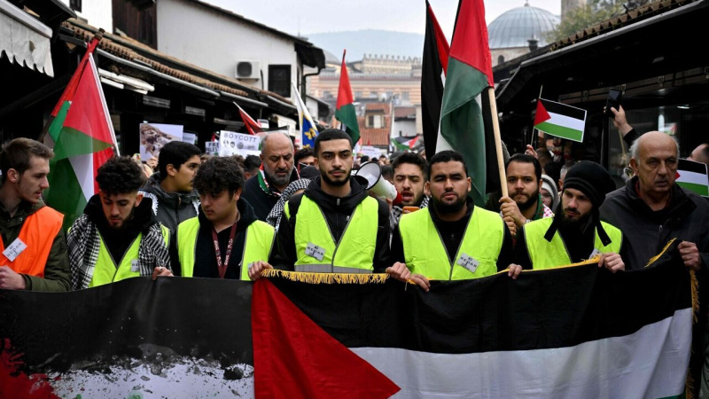 Еще тысячи протестовали на исторической площади Башария в столице Боснии Сараево с плакатами с надписью: «Сребреница вчера, Газа сегодня». Они также скандировали: «Свободу Палестине, конец геноциду».