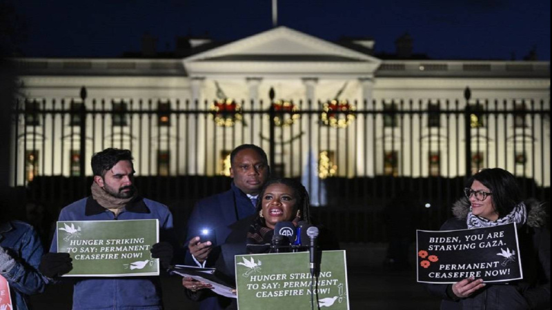 Демонстранты, объявившие голодовку в поддержку Газы, несли плакаты с надписью: «Байден, ты моришь Газу голодом!».