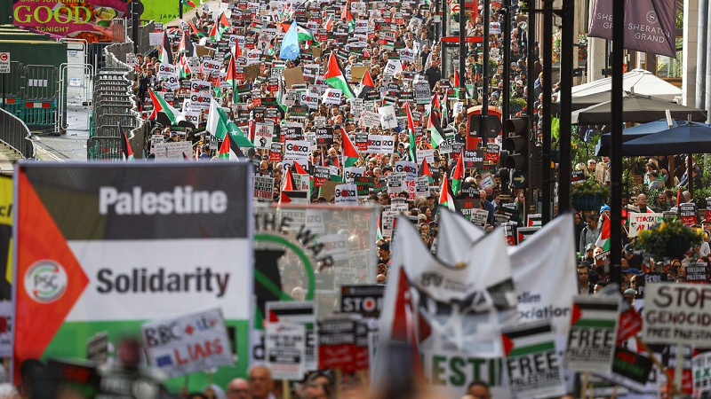 В Лондоне пропалестинские группы также провели массовые акции протеста против военных преступлений сионистского режима в секторе Газа и потребовали немедленного прекращения огня в этом секторе.