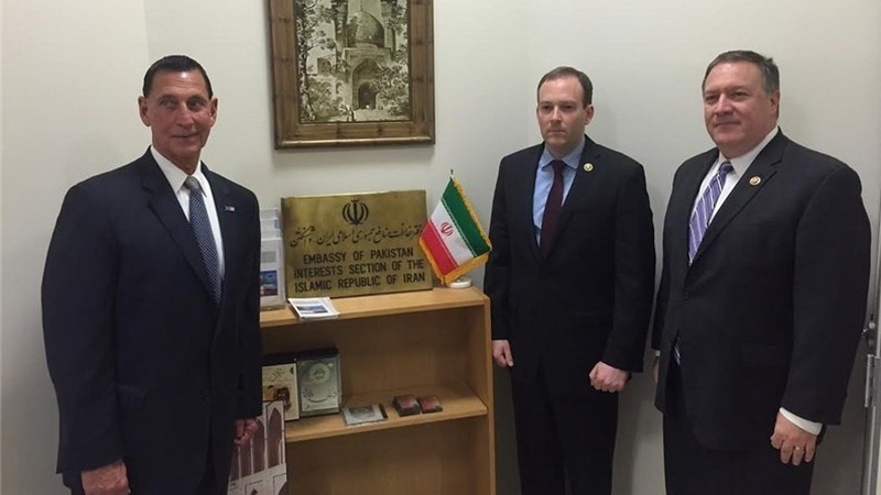 Имя Помпео впервые прозвучало в Иране в феврале 2016 г., когда он запросил визу для поездки в ИРИ. Вместе с конгрессменами-республиканцами Ли Зедлином от Нью-Йорка и Фрэнком Лубиндо от Нью-Джерси он обратился за визитом в бюро защиты интересов ИРИ в Вашингтоне. В то время эти трое передали в иранское представительство в Пакистане письмо, адресованное верховному лидеру ИРИ И главнокомандующему Корпуса стражей исламской революции, в котором обозначили цели своей поездки в Иран.