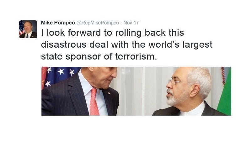 Спустя всего день после представления его кандидатуры на пост директора ЦРУ Помпео написал в Твиттере: "Надеемся вскоре повернуть вспять это катастрофическое соглашение с крупнейшим государственным спонсором терроризма в мире"