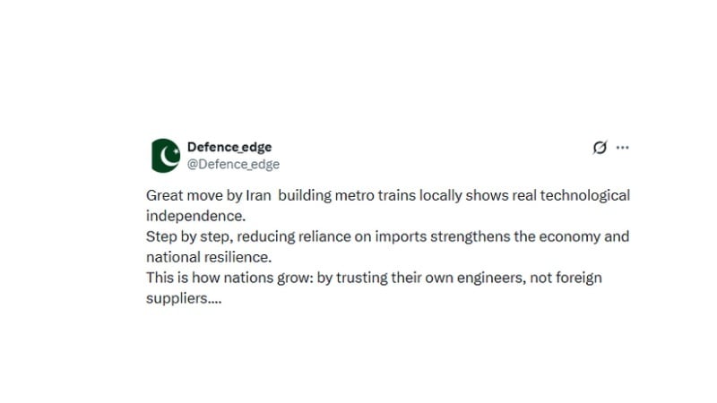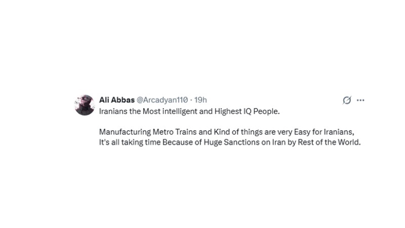 Përdoruesit e huaj në hapësirën virtuale theksojnë se prodhimi dhe ndërtimi i disa modeleve kombëtare të trenave tregon talentin dhe vendosmërinë e iranianëve për të mposhtur sanksionet dhe për të arritur vetëmjaftueshmërinë kombëtare. Sipas ParsToday, duke cituar Fars, projekti i ndërtimit të "Trenit Kombëtar të Metrosë", në bashkëpunim me 25 kompani me bazë shkencore dhe katër kompani të mëdha industriale, ka zbatuar fazat e plota të prodhimit të modeleve kombëtare të trenave, nga projektimi fillestar deri te zbatimi, brenda kufijve të Iranit.
