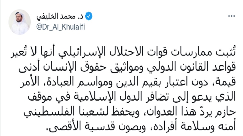 Muhamed Al-Khalifi në një mesazh në Twitter, shkroi: "Veprimet e forcave ushtarake të regjimit sionist dëshmojnë se ata nuk e vlerësojnë dhe nuk respektojnë në asnjë mënyrë ligjet ndërkombëtar dhe as konventat e të drejtave të njeriut dhe nuk vlerësojnë e as nuk respektojnë vlerat fetare dhe ritualet e adhurimit".