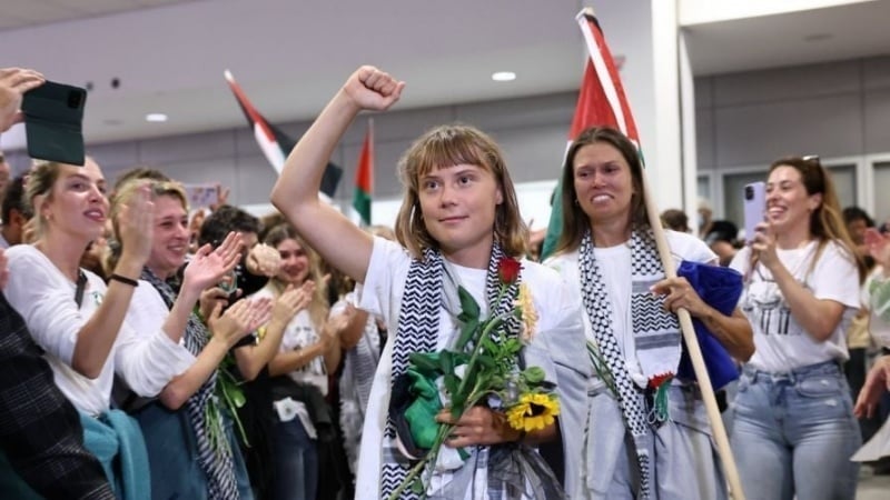 Greta Thunberg, së bashku me qindra aktivistë të të drejtave të njeriut, po përpiqej të hynte në Gaza përmes Karvanit të Rezistencës dhe të çonte ndihmë për popullin e shtypur të Gazës. Megjithatë, flotilja tyre u ndalua nga forcat pushtuese izraelite dhe anëtarët e saj u arrestuan. Shumë prej të arrestuarve, përfshirë Thunberg, iu nënshtruan dhunës dhe keqtrajtimit nga sionistët. Sipas Pars Today, këto tortura nuk e bënë atë dhe miqtë e saj të pendoheshin për vendimin e tyre ose t'i largonin nga rruga e zgjedhur, dhe që nga momenti që mbërritën në aeroport, ata filluan të ekspozonin dhe të përcillnin zërin e shtypjes së Gazës në botë.