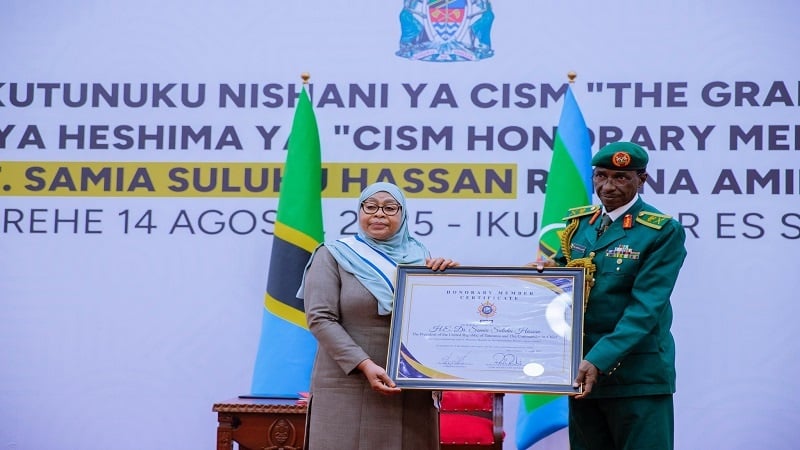 Mbali na hayo, Rais wa Jamhuri ya Muungano wa Tanzania na Amiri Jeshi Mkuu, Mhe. Dkt. Samia Suluhu Hassan alitunukiwa Nishani ya Heshima ya Juu ya Baraza la Michezo ya Majeshi Duniani (The Grand Cordon) na Makamu wa Rais wa CISM Kanda ya Afrika Meja Jenerali Maikano Abdullahi kutoka Nigeria kwenye hafla iliyofanyika Ikulu Jijini Dar es Salaam tarehe 14 Agosti, 2025. Viongozi pamoja na wageni mbalimbali waliohudhuria hafla hiyo wamempongeza Mama Samia kwa kutunukiwa Nishani ya CISM.