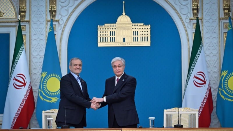 Rais Masoud Pezeshkian wa Iran (kushoto) na mwenzake Kazakhstan Kassym-Jomart Tokayev