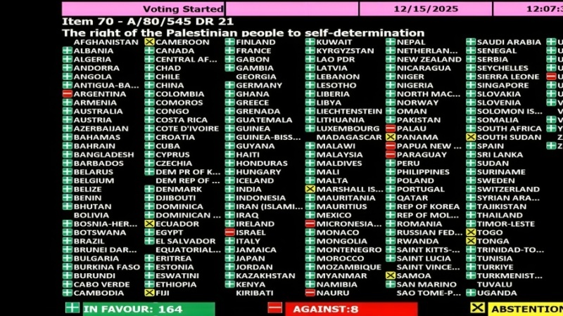 Kulingana na Pars Today, Baraza Kuu la Umoja wa Mataifa limepasisha kwa wingi wa kura azimio linalothibitisha haki ya watu wa Palestina ya kujiamulia mambo yao, ikiwa ni pamoja na haki ya kuwa na taifa huru la Palestina. Azimio hilo lilipitishwa kwa kuungwa mkono na nchi wanachama 164, huku kura nane pekee zikilipinga. Aidha nchi tisa pia zilijizuia kupiga kura.